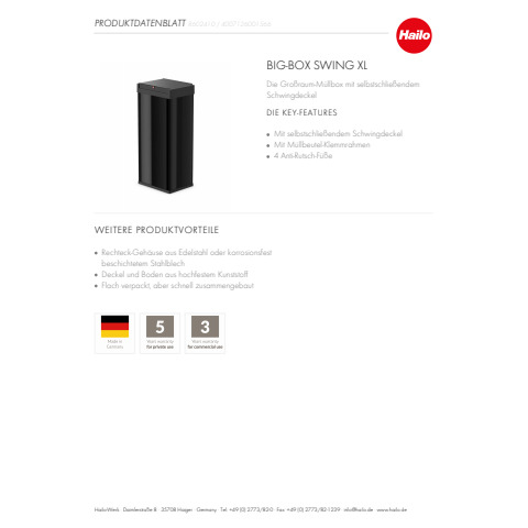 Großraum-Abfallbox Hailo Big-Box Swing XL mit dem extra großen Volumen und automatisch schließendem Deckel. Rechteck-Gehäuse aus Stahlblech, silber. Deckel und Boden aus hochfestem Kunststoff. Selbstschließender, zweigeteilter Schwingdeckel. Mit patentiertem Müllbeutel-Klemmrahmen. Deckelverrastung zum kompletten Öffnen der Schwingdeckel. 4 Anti-Rutsch-Füße. Flach verpackt, aber schnell zusammengebaut. Made in Germany.