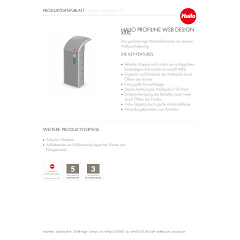 Hailo ProfiLine WSB Design XXXL. Der großvolumige Wertstoffsammler mit cleverer Müllsackhalterung. Grau. Behälter, Klappe und Fronttür aus schlagzähem, beständigem technischen Kunststoff (ABS). Einsetzen und Entnahme der Müllsäcke durch Öffnen der Fronttür. Extra große Einwurfklappe. Stabile Halterung für Müllsäcke (120 Liter). Einfache Reinigung des Behälters auch Innen durch Öffnen der Fronttür. Hohe Stabilität durch große Aufstandsfläche. Verbindungsklammern zum Anreihen. Zubehör: Mobilset. Aufklebersets zur Mülltrennung liegen bei (Farbe und Piktogramme).