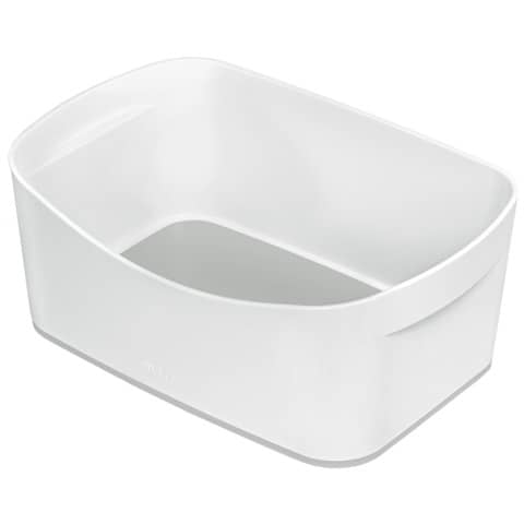 Leitz Aufbewahrungsschale MyBox, für DIN A5. Zur Aufbewahrung von häufig genutzen Utensilien im Büro, an der Rezeption oder zu Hause. Mit weichen, abgerundeten Ecken für eine einfache Reinigung. Konische Form für platzsparendes Transportieren. Bei Nichtgebrauch platzsparend ineinander stapelbar. Mit Zweifarbeneffekt: weiße Hochglanzoptik, Boden in attraktiver Farbe. Robust, kratzfest und wasserdicht. Kein Modul für die Aufbewahrungsboxen MyBox. Material: hochwertiger ABS-Kunststoff (ohne Bisphenol A / BPA). Format: 246 x 98 x 160 mm. Farbe: weiß/grau.