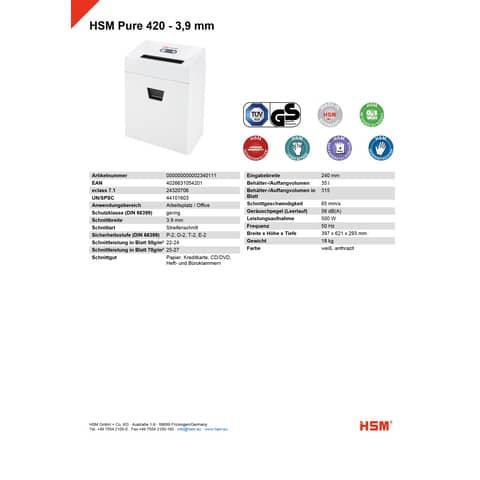 Aktenvernichter Pure 420 weiß HSM 2340111 Streif.3,9