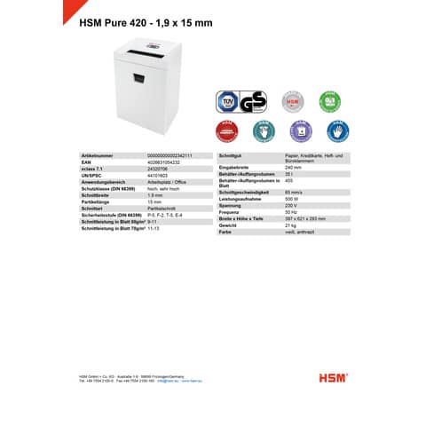 Aktenvernichter Pure 420 weiß HSM 2342111 Part. 1,9x15mm
