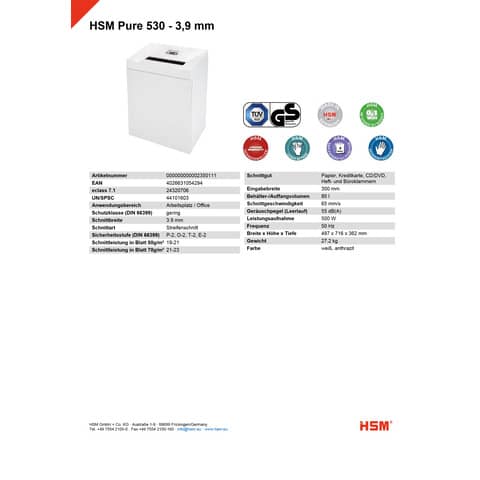 Aktenvernichter Pure 530 weiß HSM 2350111 Streif.3,9