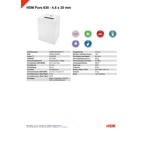 Aktenvernichter Pure 630 weiß HSM 2363111 Part. 4,5x30mm
