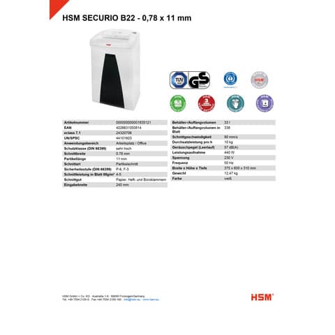 Hersteller: HSM GmbH + Co. KG, Austraße 1 - 9, 88699 Frickingen, Deutschland, info@hsm.eu