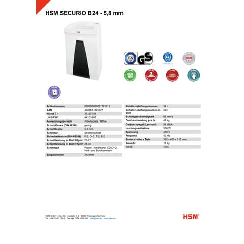 Hersteller: HSM GmbH + Co. KG, Austraße 1 - 9, 88699 Frickingen, Deutschland, info@hsm.eu