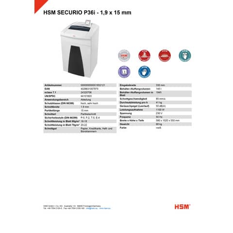 Hersteller: HSM GmbH + Co. KG, Austraße 1 - 9, 88699 Frickingen, Deutschland, info@hsm.eu