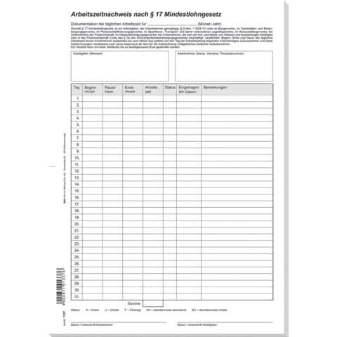 Seit dem 01.01.2015 gilt über die Pflicht zur Zahlung des Mindestlohnes hinaus nach § 17 Mindestlohngesetz die Pflicht des Arbeitgebers, die Arbeitszeiten der Arbeitnehmer aufzuzeichnen und die Aufzeichnungen mindestens 2 Jahre aufzubewahren. Die Erfüllung dieser Pflicht wird vom Zoll geprüft. Bei Feststellung eines Verstoßes drohen Bußgelder bis zu 30.000 €. Dies betrifft alle geringfügig Beschäftigten (Minijobs), außer in Privathaushalten, und alle Arbeitnehmer im Baugewerbe, im Gaststätten- und Beherbergungsgewerbe, im Personenbeförderungsgewerbe, im Speditions-, Transport- und Logistikgewerbe, im Schaustellergewerbe, bei Unternehmen der Forstwirtschaft, im Gebäudereinigungsgewerbe, im Messe- und Ausstellungsgewerbe und in der Fleischwirtschaft. Mit diesem Formularblock im Format DIN A4 mit 24 Blatt können Sie als Arbeitgeber, egal ob für geringfügig Beschäftigte (Minijobber) oder Vollzeitkräfte in den betroffenen Wirtschaftsbereichen, diese Pflicht erfüllen. Auf jedem Formularblatt wird die Arbeitszeit eines Arbeitnehmers für einen Monat (31 Tage) erfasst.