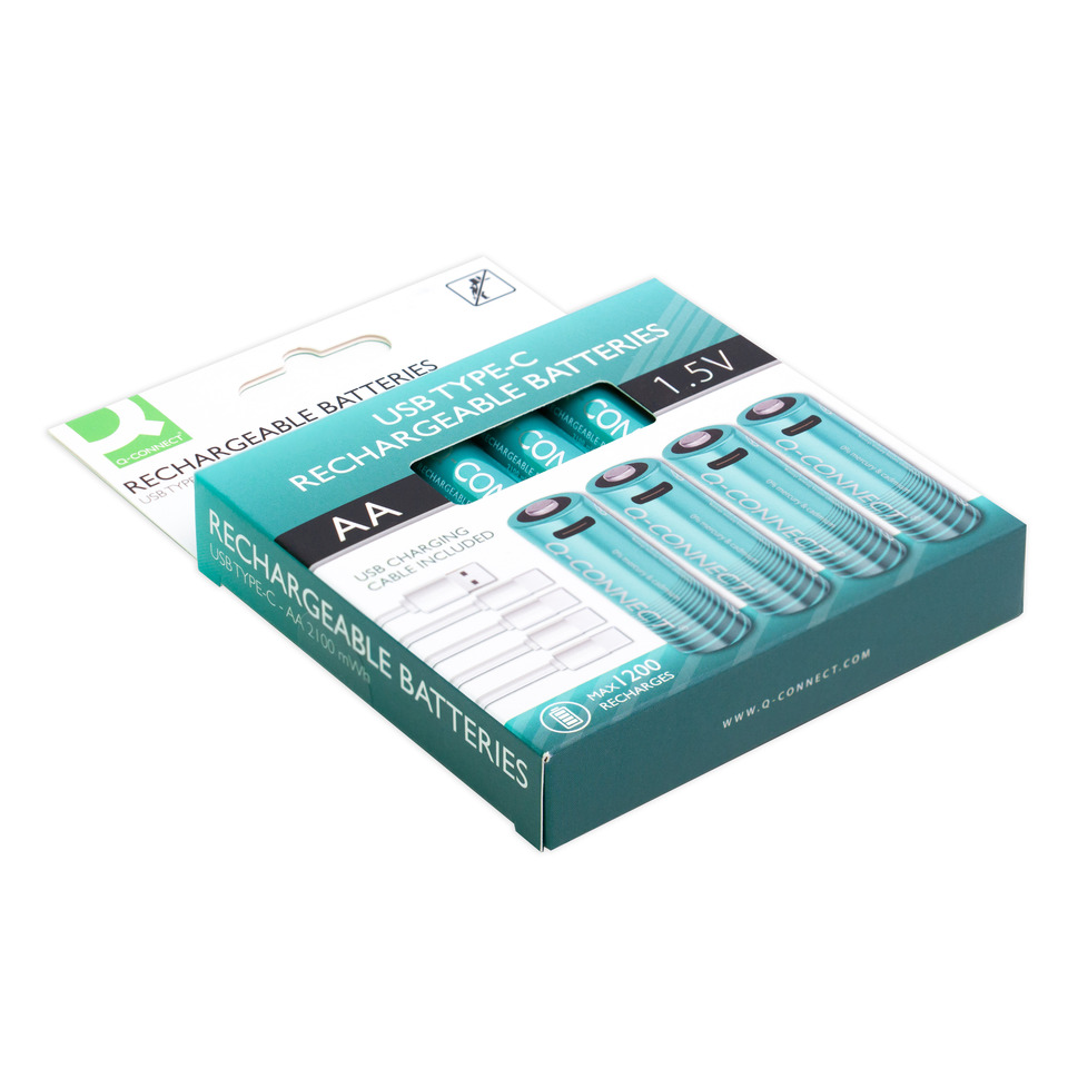 Rundzellen-Batterien mit USB-C Ladebuchse, wiederaufladbar. Die neue und umweltfreundlicher Generation wiederaufladbarer Batterien. Auflademöglichkeit der Batterie wie viele Geräte mit USB-C Ladebuchse. Ladezeit 2 Stunden. LED-Ladeindikator zeigt den Ladestatus an (Dauerhaft leuchtend = vollständig geladen; blinkend = wird aufgeladen). Inklusive USB-A Kabel auf 4-fach USB-C. Diese neuen Batterien könne über 1200-mal wieder mit Energie versorgt werden und das ganz einfach über das im Lieferumfang enthaltene USB-C Ladekabel.. Darüber hinaus kann der Hochleistungs-Akku durch die Li-Ion-Technologie mit einer extrem geringen Selbstentladung überzeugen, ohne aber dabei an Leistung einzubüßen. Mit 1,5V sind die Batterien auch für Geräte mit hohem, konstantem Spannungsbedarf besonders geeignet. Ideal für den Einsatz bei elektronisches oder funkferngesteuertes Spielzeug, tragbare CD-Player, MP3-Player, Radios, Wecker, Digitalkameras, mobile Videospiele, Computerzubehör, Taschenlampen, Flachleuchten, Fernbedienungen, Rauchmelder, Funkmäuse, Tastaturen. System: Lithium-Ionen. PG-Inhalt 4 Stück. Typ AA/Mignon/HR6. Spannung: 1,5 Volt. Dimension: Ø x H: 15x51mm. Gewicht: 18 g. Aufladestrom: 330 mA. Energie 2100 mWh.