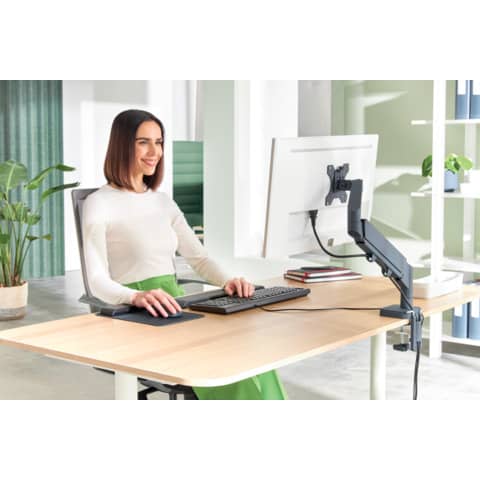 Leitz Single Monitorarm Ergo. Platzsparend. Ergonomischer Single Monitorarm, der die Körperhaltung, die Ausrichtung der Augen und den Nacken- und Schulterkomfort verbessern kann, wenn die Höhe des Monitors richtig eingestellt ist. Das platzsparende Design ermöglicht die Montage auf kleinstem Raum und bietet dennoch maximale Schärfentiefe und optimale visuelle Ergonomie. Vereinfachte Höheneinstellung des Bildschirms (185 mm - 435 mm) dank Sprungfeder. Ermöglicht 180° Drehung und Monitorrotation, +/- 90° Neigungsverstellung, und erlaubt Aufwärts-, Abwärts-, Vorwärts- und Rückwärtsbewegung. Das stabile Design unterstützt einen flachen oder gebogenen 17"-32"-Monitor mit einem Gewicht von bis zu 9 kg. Einfache Montage durch die mitgelieferte abnehmbare Vesa®-Platte (75 und 100 mm) und die silikonbeschichtete C-Klemme, die Vibrationen reduziert und die Tischoberfläche schützt, oder durch die Tüllenöffnung (Tischplattenstärke: 10-80 mm). Werkzeuge für die Montage im Lieferumfang enthalten. Das integrierte Kabelmanagementsystem organisiert die Monitorkabel und sorgt somit für einen aufgeräumten Arbeitsbereich. IGR-zertifiziert (Institut für Gesundheit und Ergonomie) und TÜV-zertifiziert. Maximale Monitorgröße: 17" bis 32". Höhenanpassung: 185 - 435 mm. Monitorneigung: +/- 90°. Monitordrehung: +180°. Maximales Monitorgewicht: 9 kg. Material: Metall/Kunststoff. Format: 550 x 110 x 520 mm. Gewicht: 2,7 kg. 2 Jahre Garantie. Farbe: samtgrau.