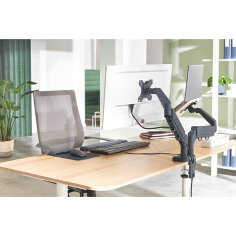 Leitz Dual Monitor- und Laptoparm Ergo. Platzsparend. Ergonomischer Dual Monitorarm mit Laptophalterung, der die Körperhaltung, die Ausrichtung der Augen und den Nacken- und Schulterkomfort verbessern kann, wenn die Höhe der Monitorr richtig eingestellt ist. Das platzsparende Design ermöglicht die Montage auf kleinstem Raum und bietet dennoch maximale Schärfentiefe und optimale visuelle Ergonomie. Der Monitor und der Laptop können völlig unabhängig voneinander eingestellt werden. Vereinfachte Höheneinstellung des Bildschirms und Laptops (185 mm - 435 mm) dank Sprungfeder. Ermöglicht 180° Drehung und Monitorrotation, +/- 90° Neigungsverstellung, und erlaubt Aufwärts-, Abwärts-, Vorwärts- und Rückwärtsbewegung. Das stabile Design unterstützteinen flachen oder gebogenen 17"-32" Monitor mit einem Gewicht von bis zu 9 kg und einen 13-17" Laptop mit einer maximalen Dicke von 2,4cm. Einfache Montage durch die mitgelieferte abnehmbare Vesa®-Platte (75 und 100 mm) und die silikonbeschichtete C-Klemme, die Vibrationen reduziert und die Tischoberfläche schützt, oder durch die Tüllenöffnung (Tischplattenstärke: 10-80 mm). Werkzeuge für die Montage im Lieferumfang enthalten. Das integrierte Kabelmanagementsystem organisiert die Monitorkabel und sorgt somit für einen aufgeräumten Arbeitsbereich. IGR-zertifiziert (Institut für Gesundheit und Ergonomie; bezieht sich auf den Dual Monitoram, nicht das Set) und TÜV-zertifiziert. Maximale Monitorgröße: 17" bis 32", maximal Laptopgröße: 13" bis 17". Höhenanpassung: 185 - 435 mm. Monitorneigung: +/- 90°. Monitordrehung: +180°. Maximales Monitorgewicht: 9 kg. Material: Metall/Kunststoff. Format: 1120 x 110 x 600 mm. Gewicht: 5,1 kg. 2 Jahre Garantie. Farbe: samtgrau.
