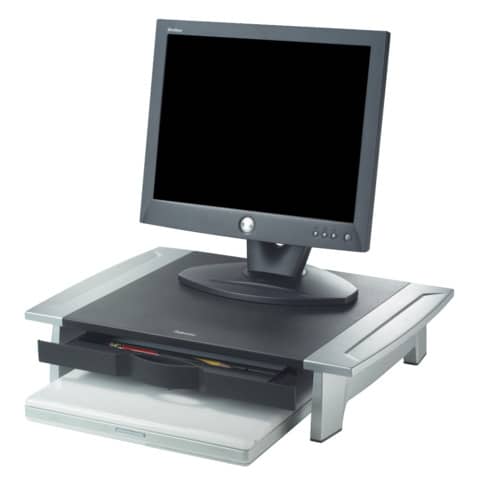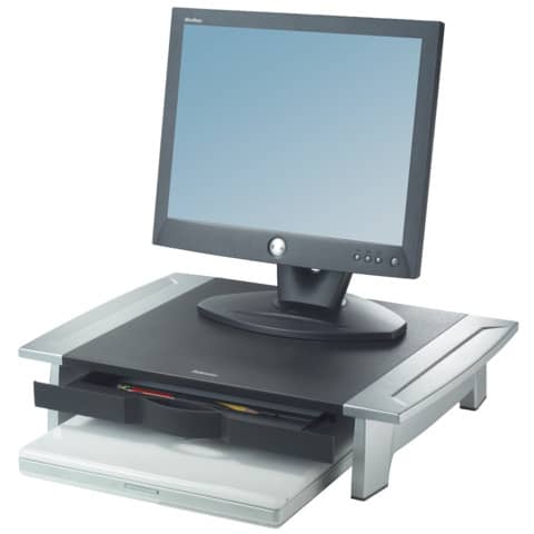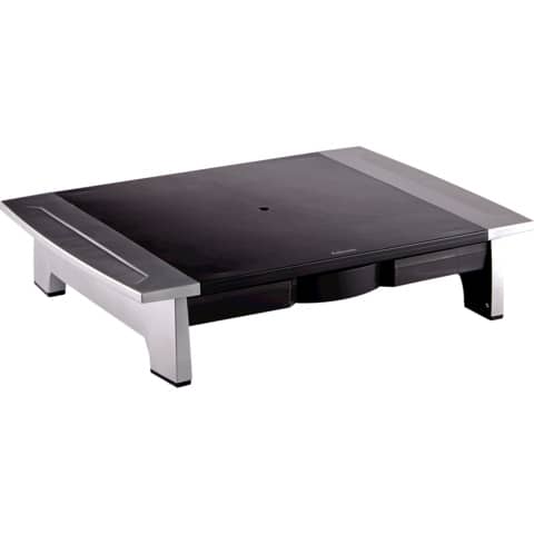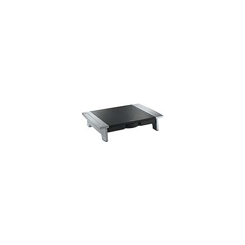 Monitor Ständer Standard Office Suites. Ausstattung: höhenverstellbar. Verstellbare Füße ermöglichen 5 Höheneinstellungen. Laptop oder Tastatur kann platzsparend unter dem Monitor platziert werden. Mit Schublade zur Ablage von Büromaterial. Geeignet für Monitore bis 71,12cm (28") bzw. max. 36kg. Entspricht der BS EN ISO 9241, bestätigt durch FIRA International Ltd (unabhängige Ergonomie Akkreditierungsstelle). Werkstoff: Kunststoff. Größe (B x T): 504,8 x 357,2 mm. Höhe min./max.: 106,4/159 mm. Farbe: schwarz/silber.