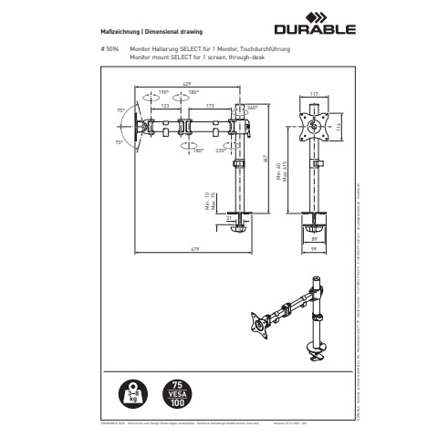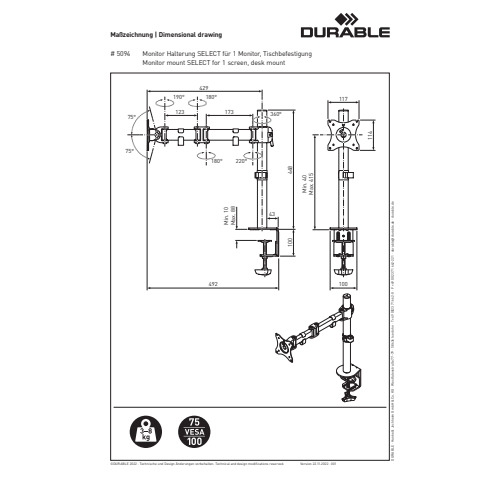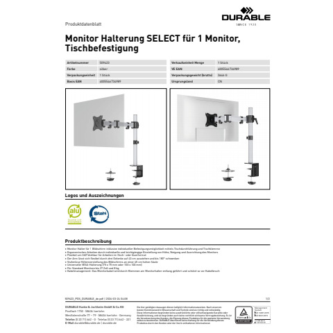 Produktinformationen "Bildschirmträger SELECT 1 Monitor 27 Zol DURABLE 5094 23 Tischklemme Stahl"