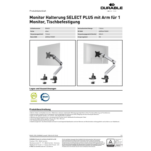 Produktinformationen "Bildschirmträger SELECT PLUS 1 Monit 32Z DURABLE 5096 23 Tischklemme Alu"