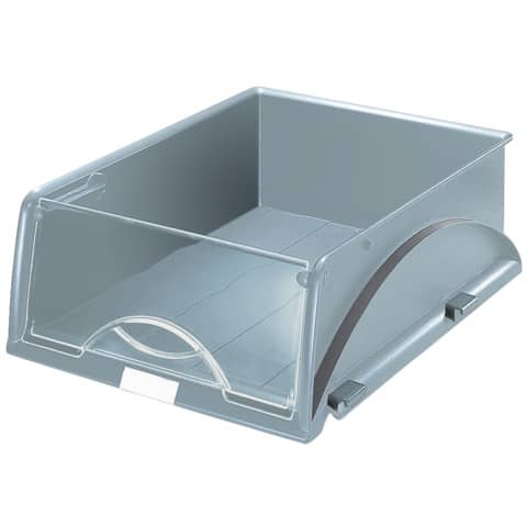 Briefkorb Sorty. Mehrfach übereinander stapelbar, mit grau transparenter, auswechselbarer Frontklappe. Mit Beschriftungsschild. Material: Polystyrol (PS). Für A4-Längsformat. Format: 291 x 380 x 127 mm. Farbe: grau.