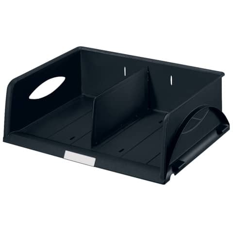 Leitz Briefkorb Sorty. Mehrfach übereinander stapelbar, mit grau-transparenter, auswechselbarer Trennwand und Beschriftungsschild. Material: Polystyrol (PS). Für A4- und C4-Querformate. Format: 408 x 295 x 127 mm. Farbe: schwarz. Zweifache Unterteilung für z. B. DL-Formate möglich. Lieferung inkl. einer Trennwand.