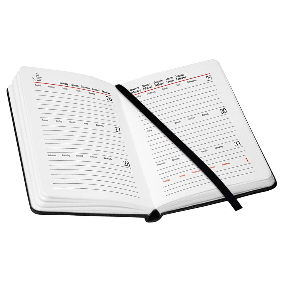 Kompakt, praktisch und stilvoll: Der BSB V-Book Buchkalender im handlichen A6-Format (ca. 9 x 14 cm) überzeugt mit einem weichen Kunstledereinband, edler Jahreszahlprägung und einem elastischen Gummiband. Die Wochenübersicht ist übersichtlich auf zwei Seiten verteilt und wird durch nützliche Infoseiten ergänzt. Mit 57 Kalenderblättern und 39 Notizblättern bietet dieser Kalender eine ideale Kombination aus Termin- und Notizverwaltung – perfekt für den mobilen Einsatz.