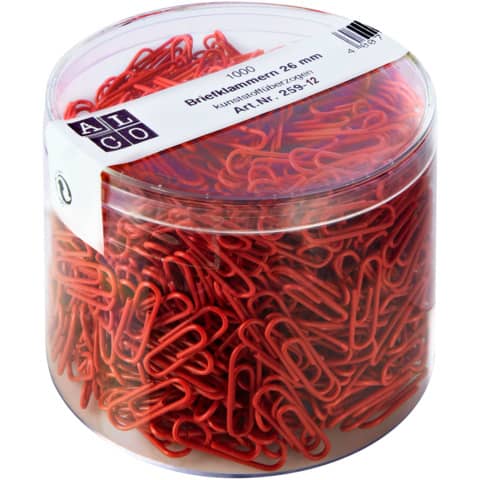 Briefklammer. Runde Form, Metall, kunststoffüberzogen. Länge: 26 mm. Farbe: rot. Packungsart/-inhalt: Dose, 1000 Stück