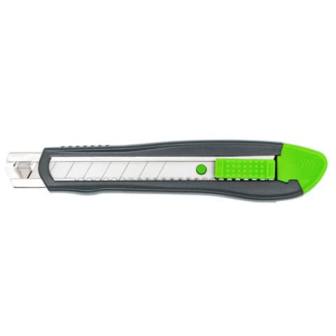 Kunststoffcutter mit 18 mm-Klinge für leichte bis mittlere Schnitte. Metall-Messerführung. Schieberaster, Klingenabbrecher. Leichter Klingenwechsel.