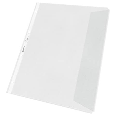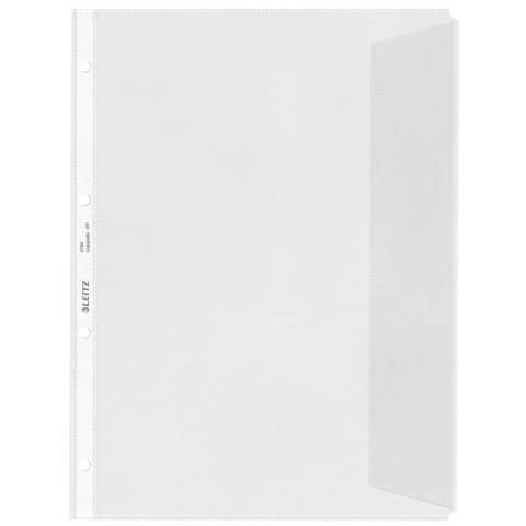 Prospekthülle, Aussenseite offen, mit Klappe, dokumentenecht, genarbt, mit 4-fach Lochung. Material: Polypropylen (PP), 0,12 mm. Format: für A4. Farbe: farblos.