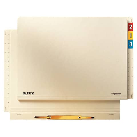 Einstellhefter Orgacolor®, für kaufmännische Heftung, mit bewegelichem Heftfalz, Heftmechanik 80 mm, Rückdeckel mit 18 mm vorstehendem Tab, mit Markierungslinien zum Aufkleben von Orgacolor® Beschriftungsschildchen, mit 2 Schlitzstanzungen oben und unten für Stecksignale 6030 · Material: Kraftkarton 260 g/gm (RC) · Format: 305/323 x 230 mm · Farbe: chamois