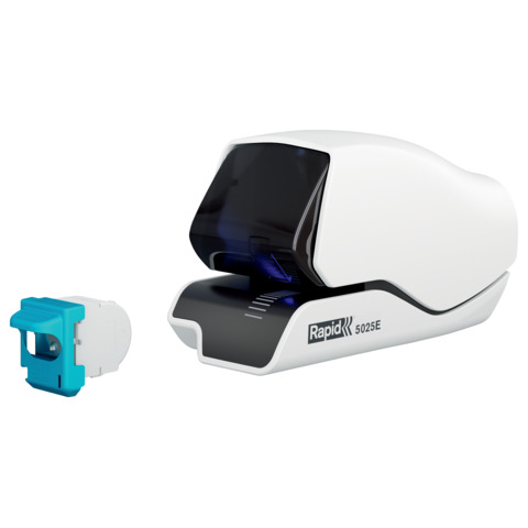 Elektrisches Heftgerät 5025e, mit LED-Führungssystem, mit patentierter Kassettenheft-Technologie für Heften mit hoher Frequenz und Flatclinch-Technologie für 30% verringerte Stapelhöhe, Verschleißteile werden mit jeder neuen Kassette ersetzt, Lieferung mit Kassette. Heftklammertyp: Kassette 5020. Heftleistung/Blatt: 2,5mm/25. Einlegetiefe: bis 25mm. Material: Kunststoff. Farbe: weiß.