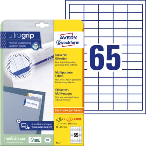 Die einzigartige ultragrip-Technologie auf der Rückseite des Bogens garantiert präzisen Druckereinzug und staufreies drucken. Ideal für die Stapelverarbeitung von Etikettenbogen. Druckerdurchlauf für Laserdrucker getestet und bestätigt durch TÜV Süd. Mit der einzigartigen QuickPEEL™ Abziehhilfe lassen sich die Etiketten jetzt noch einfacher und schneller abziehen. Sicherer Druckerdurchlauf, klares Druckbild, sichere Haftung bei allen Standardanwendungen. Umweltfreundliche Etiketten, recycelbar mit dem Altpapier. Mit Papier aus vorbildlich bewirtschafteten Wäldern. Kostenlose Vorlagen und Software unter www.avery-zweckform.eu/print. Hervorragende Laufeigenschaft auf Inkjet-, Laser-, Farblaserdruckern und Kopierern. Auf A4 Blättern.