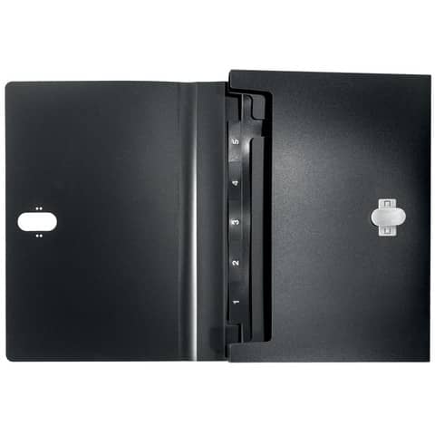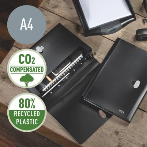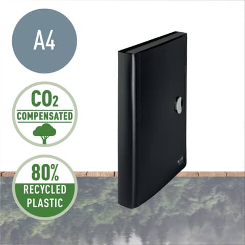 Leitz Projektmappe Recycle. Hergestellt aus 80% recyceltem Material und zu 100% recycelbar. Mit recycelbarem Sicherheitsverschluss. Für die Projektorganisation. Leicht, langlebig und wiederverwendbar. Blickdicht. 5 Fächer mit Beschriftungstaben und einem zusätzlichen Fach für die Aufbewahrung von Utensilien oder Notizbüchern. Verpackungs-Banderole aus 100% recyceltem Karton. Kapazität: bis zu 250 Blatt DIN A4 (80 gm). Material: 80% recyceltes Polypropylen (PP), Einband: 0,65 mm, Fächer: 0,18 mm. Format: für DIN A4, 330 x 240 x 41 mm. Farbe: schwarz.