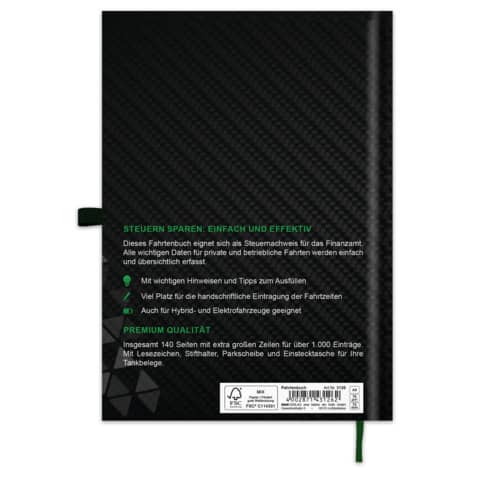 Premium Fahrtenbuch für Pkw, 144 Seiten, DIN A5. Produktverwendung: steuerlicher Kilometernachweis. Ausführung: Rückstichheftung. Im Hardcover mit Stifthalter, Lesezeichen und Einstecktasche. Ausführung Einband: Hardcover, bunt. Anzahl der Seiten des Spaltenschemas: 144. Papierformat: DIN A5. Anzahl der Blätter: 144 Blatt.