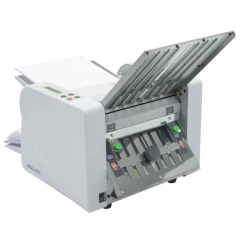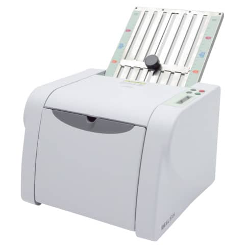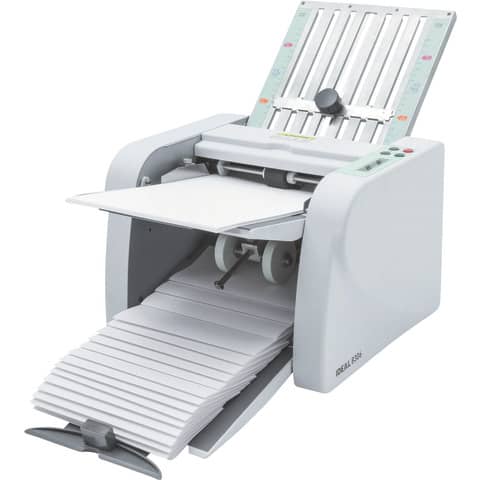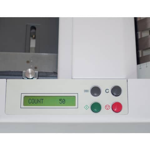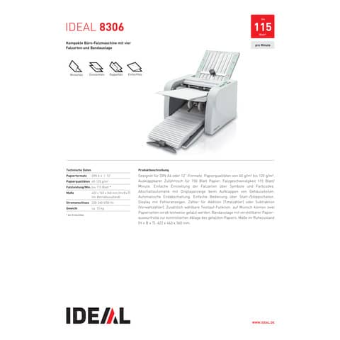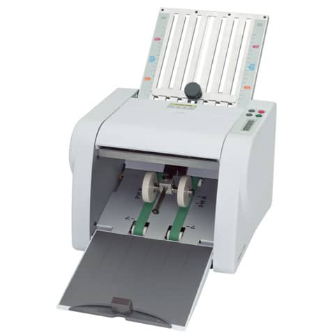 Kompakte Büro-Falzmaschine mit vier Falzarten und Bandauslage. Geeignet für A4 oder 12"-Formate. Papierqualitäten von 60 g/qm bis 120 g/qm. Ausklappbarer Zuführtisch für bis zu 150 Blatt Papier. Falzgeschwindigkeit 115 Blatt/ Minute. Einfache Einstellung der Falzarten über Symbole und Farbcodes. Abschaltautomatik mit Displayanzeige beim Aufklappen von Gehäuseteilen. Automatische-Endabschaltung. Einfache Bedienung über Start-/ Stoppschalter. Display mit Fehleranzeigen. Zähler für Addition (Totalzähler) oder Subtraktion (Vorwahlzähler). Bandauslage mit verstellbarer Papierauswurfrolle zur kontrollierten Ablage des gefalzten Papiers. Größe im Ruhezustand: 463 x 422 x 360 mm (B x H x T).