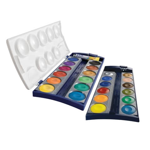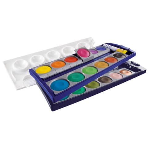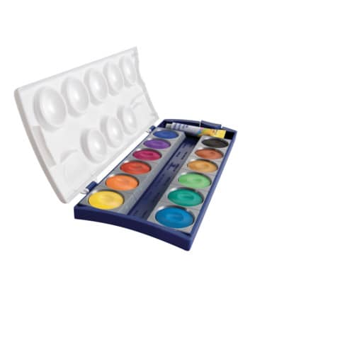 Die Nr. 1 in der Schule. Nach DIN 5023. Von Lehrern empfohlen. Unterstützt die lernplangerechte Farbenlehre. Starke Deckkraft. Gute Haftung. Lichtechte Pigmente. Auswechselbare Farbschälchen. Deckel mit vielen Mischtöpfchen. Beschriftbares Namensfeld.