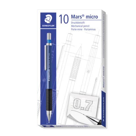 Druckbleistift Mars® micro. Ausführung: Spitze voll versenkbar, Mine auswechselbar, Mine federnd gelagert, Druckmechanik. Material des Schaftes: Kunststoffschaft. Ausführung der Griffzone: Rutschfeste Kautschuk-Griffzone. ISO-Kennzeichnung vorhanden. Radierer vorhanden. Radierer auswechselbar. Clip vorhanden. Einfach nachfüllbar durch 12 auf einen Streich. Farbe des Schaftes: blau. Stärke der Mine: 0,7 mm. Bezeichnung der Härte: B.