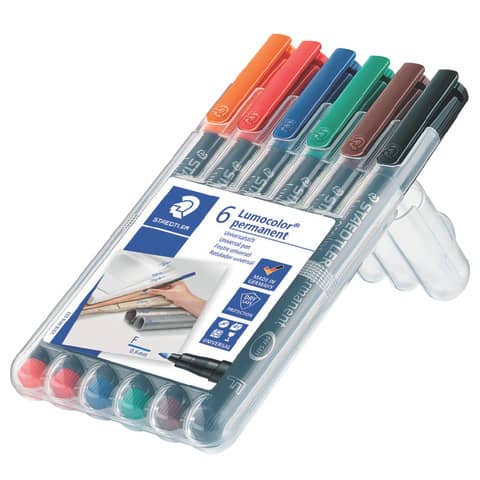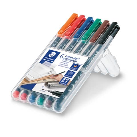 Feinschreiber Lumocolor® Universalstift permanent. Nachfüllbar. Ausführung Spitze: F-Spitze, ca. 0.6 mm. Art der Schreibflüssigkeit: geruchsarme Tinte. 2 rot, 3 blau, 4 orange, 5 grün, 7 braun, 9 schwarz, wasserfest, lichtbeständig gegeben. Kann einige Tage offen liegen bleiben, ohne einzutrocknen. Efficient for ecology: Schaft und Kappe aus PP garantieren lange Lebensdauer, einfaches Nachfüllen mit Tankstelle 487 17. Farbe der Kappe: in Schreibfarbe. Material des Clips: Kunststoff. Farbe des Schaftes: schwarz. Ausführung des Inhalts mit Packung: aufstellbare STAEDTLER Box mit 6 Farben. Gehäuse aus 97% recyceltem Plastik.