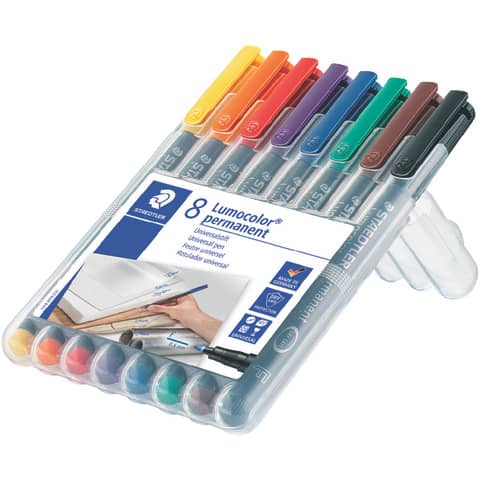 Feinschreiber Lumocolor® Universalstift permanent. Nachfüllbar. Ausführung Spitze: F-Spitze, ca. 0.6 mm. Art der Schreibflüssigkeit: geruchsarme Tinte. 1 gelb, 2 rot, 3 blau, 4 orange, 5 grün, 6 violett, 7 braun, 9 schwarz, wasserfest, lichtbeständig gegeben. Kann einige Tage offen liegen bleiben, ohne einzutrocknen. Efficient for ecology: Schaft und Kappe aus PP garantieren lange Lebensdauer, einfaches Nachfüllen mit Tankstelle 487 17. Farbe der Kappe: in Schreibfarbe. Material des Clips: Kunststoff. Farbe des Schaftes: schwarz. Ausführung des Inhalts mit Packung: aufstellbare STAEDTLER Box mit 8 Farben. Gehäuse aus 97% recyceltem Plastik.