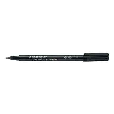 Feinschreiber Lumocolor® Universalstift permanent. Nachfüllbar. Ausführung Spitze: F-Spitze, ca. 0.6 mm. Art der Schreibflüssigkeit: geruchsarme Tinte. Schwarz, wasserfest, lichtbeständig gegeben. Kann einige Tage offen liegen bleiben, ohne einzutrocknen. Efficient for ecology: Schaft und Kappe aus PP garantieren lange Lebensdauer, einfaches Nachfüllen mit Tankstelle 487 17. Farbe der Kappe: in Schreibfarbe. Material des Clips: Kunststoff. Farbe des Schaftes: schwarz. Gehäuse aus 97% recyceltem Plastik.