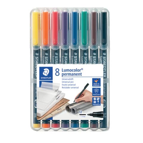 Feinschreiber Universalstift Lumocolor® permanent. Nachfüllbar. Ausführung Spitze: M-Spitze, ca. 1.0 mm. Art der Schreibflüssigkeit: geruchsarme Tinte. 1 gelb, 2 rot, 3 blau, 4 orange, 5 grün, 6 violett, 7 braun, 9 schwarz, wasserfest, lichtbeständig gegeben. Kann einige Tage offen liegen bleiben, ohne einzutrocknen. Efficient for ecology: Schaft und Kappe aus PP garantieren lange Lebensdauer, einfaches Nachfüllen mit Tankstelle 487 17. Farbe der Kappe: in Schreibfarbe. Material des Clips: Kunststoff. Farbe des Schaftes: schwarz. Ausführung des Inhalts mit Packung: aufstellbare STAEDTLER Box mit 8 Farben. Gehäuse aus 97% recyceltem Plastik.