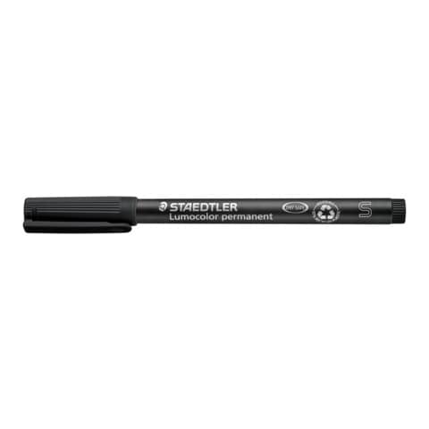 Feinschreiber Universalstift Lumocolor® permanent. Nachfüllbar. Ausführung Spitze: S-Spitze, ca. 0.4 mm. Art der Schreibflüssigkeit: geruchsarme Tinte. Schwarz, wasserfest, lichtbeständig gegeben. Kann einige Tage offen liegen bleiben, ohne einzutrocknen. Efficient for ecology: Schaft und Kappe aus PP garantieren lange Lebensdauer, einfaches Nachfüllen mit Tankstelle 487 17. Farbe der Kappe: in Schreibfarbe. Material des Clips: Kunststoff. Farbe des Schaftes: schwarz. Gehäuse aus 97% recyceltem Plastik.
