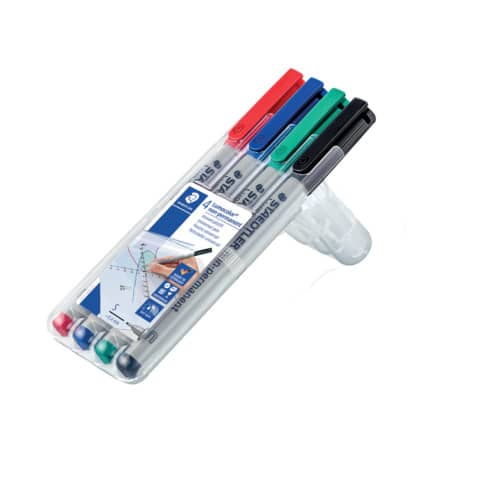 Feinschreiber Universalstift Lumocolor® non-permanent. Nachfüllbar. Ausführung Spitze: S-Spitze, ca. 0.4 mm. Art der Schreibflüssigkeit: geruchsarme Tinte, 2 rot, 3 blau, 5 grün, 9 schwarz. Für Overhead-Projektion und fast alle Flächen, feucht abwischbar von Folien, wasserlösliche Tinte, schnelltrocknend, höchste Farbbrillanz, mit Clip, Schaft und Kappe aus PP garantieren lange Lebensdauer. Farbe der Kappe: in Schreibfarbe. Material des Clips: Kunststoff. Farbe des Schaftes: grau. Ausführung des Inhalts mit Packung: aufstellbare STAEDTLER Box mit 4 Farben. Gehäuse aus 97% recyceltem Plastik.