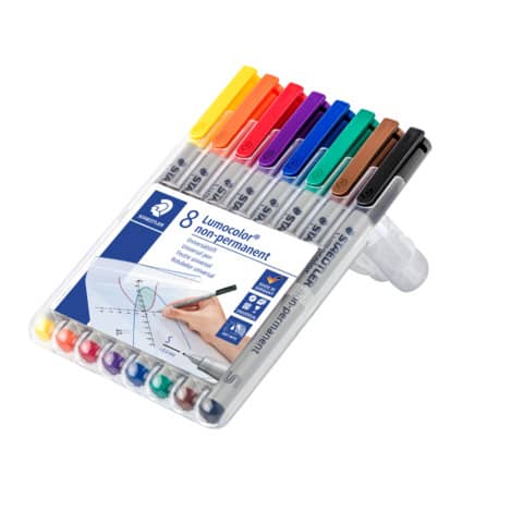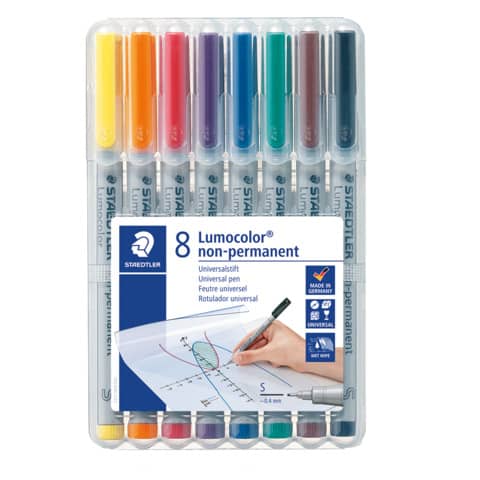 Feinschreiber Universalstift Lumocolor® non-permanent. Typbezeichnung der Mine: -. Nachfüllbar. Ausführung Spitze: S-Spitze, ca. 0.4 mm. Art der Schreibflüssigkeit: geruchsarme Tinte, 1 gelb, 2 rot, 3 blau, 4 orange, 5 grün, 6 violett, 7 braun, 9 schwarz. Für Overhead-Projektion und fast alle Flächen, feucht abwischbar von Folien, wasserlösliche Tinte, schnelltrocknend, höchste Farbbrillanz, mit Clip, Schaft und Kappe aus PP garantieren lange Lebensdauer. Farbe der Kappe: in Schreibfarbe. Material des Clips: Kunststoff. Farbe des Schaftes: grau. Ausführung des Inhalts mit Packung: STAEDTLER Box mit 8 Farben. Gehäuse aus 97% recyceltem Plastik.