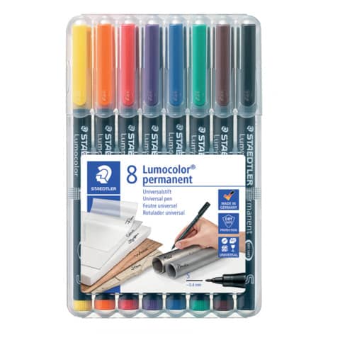 Feinschreiber Universalstift Lumocolor® permanent. Nachfüllbar. Ausführung Spitze: S-Spitze, ca. 0.4 mm. Art der Schreibflüssigkeit: geruchsarme Tinte. 1 gelb, 2 rot, 3 blau, 4 orange, 5 grün, 6 violett, 7 braun, 9 schwarz, wasserfest, lichtbeständig gegeben. Kann einige Tage offen liegen bleiben, ohne einzutrocknen. Efficient for ecology: Schaft und Kappe aus PP garantieren lange Lebensdauer, einfaches Nachfüllen mit Tankstelle 487 17. Farbe der Kappe: in Schreibfarbe. Material des Clips: Kunststoff. Farbe des Schaftes: schwarz. Ausführung des Inhalts mit Packung: aufstellbare STAEDTLER Box mit 8 Farben. Gehäuse aus 97% recyceltem Plastik.