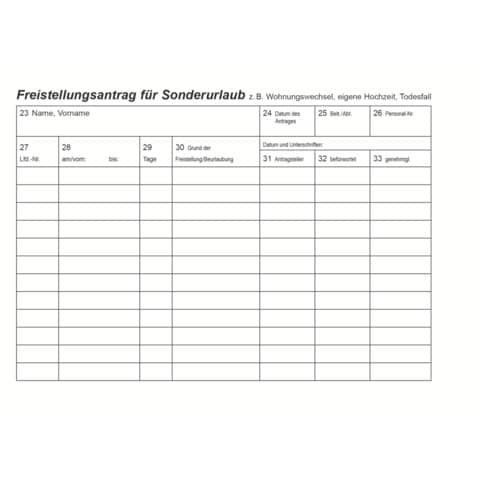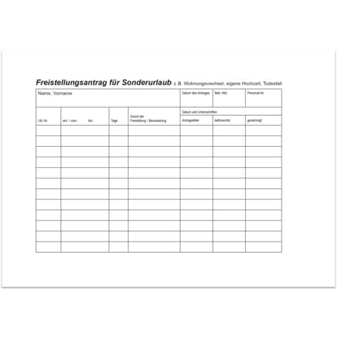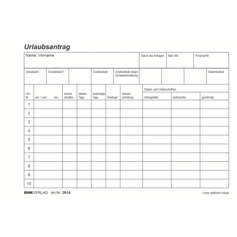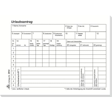 Mit der Vorderseite kann der Arbeitnehmer den Antrag auf Erholungs- oder Zusatzurlaub stellen,... mehr
