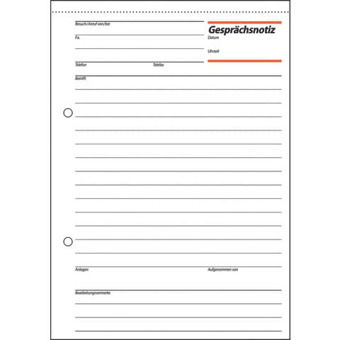 Gesprächsnotiz in praxisorientierter, übersichtlicher Gestaltung zum schnellen und präzisen Erfassen von Informationen. Abreißblock mit Deckblatt zum Schutz der Formulare, jedes Blatt mit praktischer Abheftlochung und ultra-feiner Microperforation für schnelles und sauberes Abtrennen.