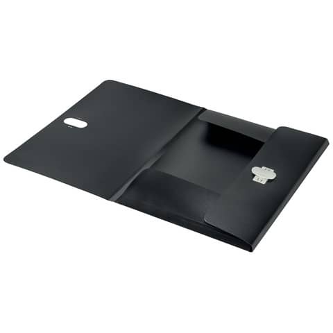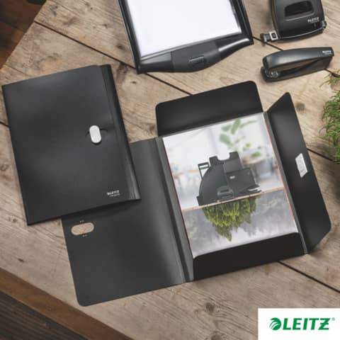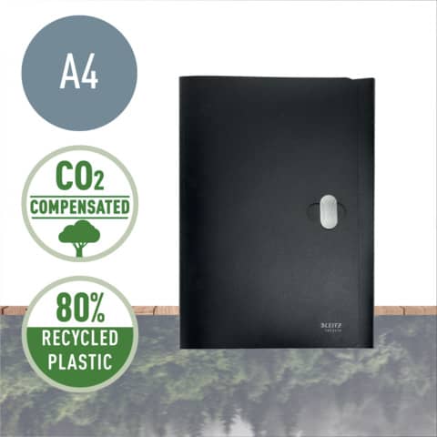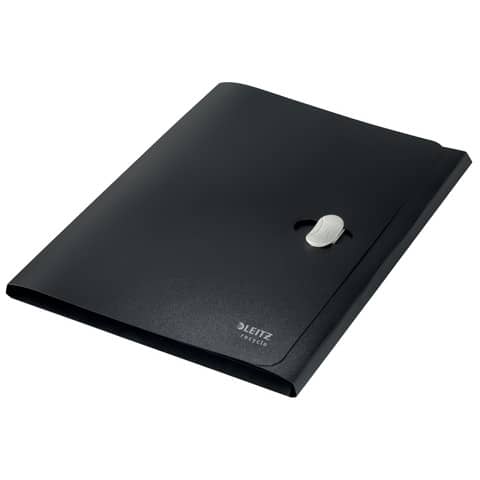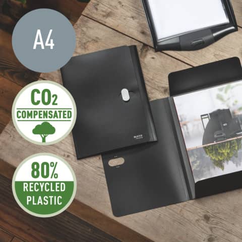 Leitz Dokumentenmappe Recycle. Hergestellt aus 80% recyceltem Kunststoff, 100% recycelbar. Leicht, langlebig und wiederverwendbar. Blickdicht. Mit recycelbarem Sicherheitsverschluss. Mit 3 Klappen am Rückdeckel innen. Kein Verpackungsabfall, Kennzeichnung nur mittels Etikett. Material: 80% recyceltes Polypropylen (PP) 0,25 mm. Kapazität: bis zu 150 Blatt DIN A4 (80 g/qm). Format: für DIN A4, 235 x 313 mm. Farbe: schwarz.