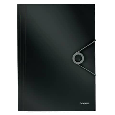 Leitz Eckspannermappe Solid. Mit 3 Klappen am Unterdeckel. Verschluss mit Gummizug. In Duo-Optik. Material: Polyproplyen (PP). Für bis zu 150 Blatt. Format: A4, 320 x 235 mm. Farbe: schwarz