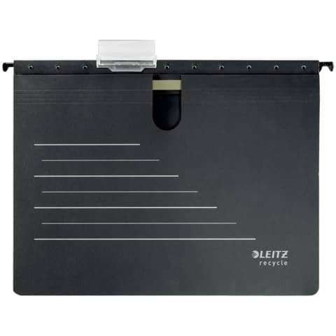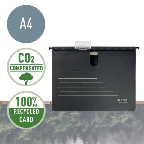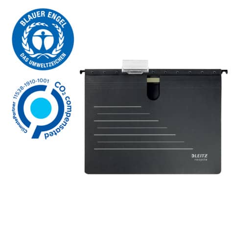 Leitz Hängehefter ALPHA® Recycle. Für kaufmännische Heftung. Der Hängehefter ist zu 100% recycelbar und besteht zu 100% aus recyceltem Material. Für die geheftete Ablage von Einzelakten. Mit Daumenausschnitt. Mit fest eingezacktem Aufreihband aus Metall. Hängeschiene mit kunststoffumsinterten Hängenasen. Mit Vollsichtreiter und auswechselbaren Blanko-Schildchen. Mit hellgrauem Druck. Kein Verpackungsabfall, Kennzeichnung nur mittels Etikett. Material: 100% recycelter Karton 275 g/qm (RC). Format: für DIN A4, 348 x 270. Farbe: schwarz.