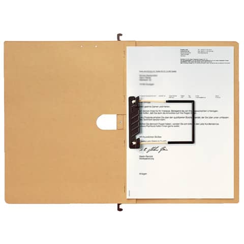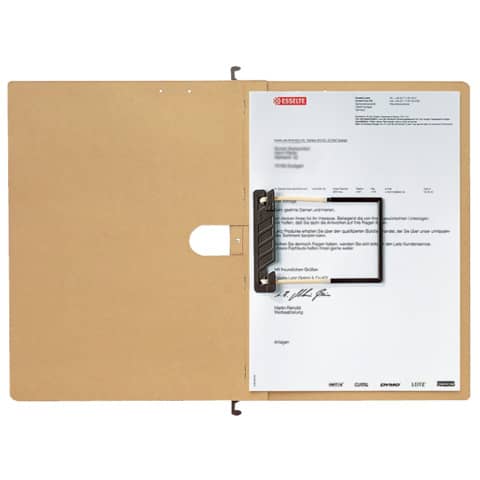 Hängehefter ALPHA®, für kaufmännische Heftung, mit Schlauchheftung Flexofil. Für die geheftete Ablage von Einzelakten. Mit Daumenausschnitt und Hängeschiene mit kunststoffumsinterten Hängenasen, Vollsichtreiter und auswechselbaren Blanko-Schildchen. Material: Natronkarton 250 g/qm (RC). Für A4. Farbe: naturbraun.