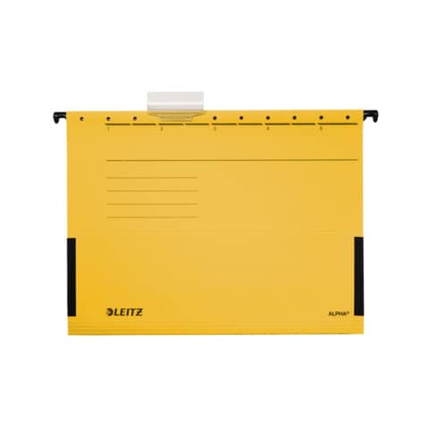 Leitz Hängetasche ALPHA®, seitlich mit Fröschen verschlossen. Für Loseblatt-Ablage von Einzelakten. Mit Schlitzstanzung für Einsteckheftstreifen (6130), Hängeschiene mit kunststoffumsinterten Hängenasen, Vollsichtreiter und auswechselbaren Blanko-Schildchen. Material: 100% Pendarec-Karton 275 g/qm (RC). Für A4. Farbe: gelb.