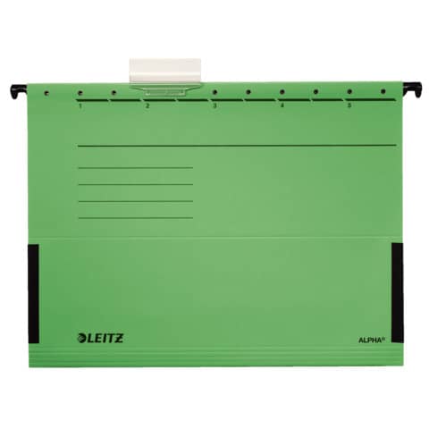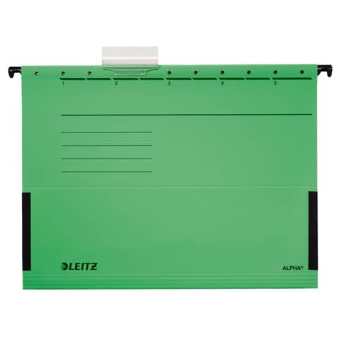 Leitz Hängetasche ALPHA®, seitlich mit Fröschen verschlossen. Für Loseblatt-Ablage von Einzelakten. Mit Schlitzstanzung für Einsteckheftstreifen (6130), Hängeschiene mit kunststoffumsinterten Hängenasen, Vollsichtreiter und auswechselbaren Blanko-Schildchen. Material: 100% Pendarec-Karton 275 g/qm (RC). Für A4. Farbe: grün.