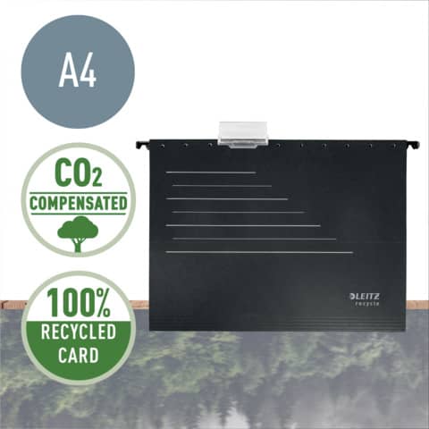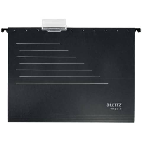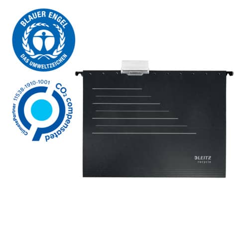 Leitz Hängemappe ALPHA® Recycle. Seitlich offen. Die Hängemappe ist zu 100% recycelbar und besteht zu 100% aus recyceltem Material. Für Loseblatt-Ablage von Einzelakten. Der V-Boden mit 15 mm fasst 150 Blatt DIN A4 (80 g/qm). Er kann dank der Falzungen erweitert werden und fasst dann bis zu 300 Blatt DIN A4 (80 g/qm). Mit Schlitzstanzung für Einsteckheftstreifen (6130). Hängeschiene mit kunststoffumsinterten Hängenasen. Mit Vollsichtreiter und auswechselbaren Blanko-Schildchen. Mit hellgrauem Druck. Kein Verpackungsabfall, Kennzeichnung nur mittels Etikett. Material: 100% recycelter Karton 275 g/qm (RC). Format: für DIN A4, 348 x 270. Farbe: schwarz.
