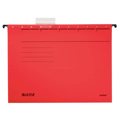 Leitz Hängemappe ALPHA®, seitlich offen. Für Loseblatt-Ablage von Einzelakten. Mit Schlitzstanzung für Einsteckheftstreifen (6130), Hängeschiene mit kunststoffumsinterten Hängenasen, Vollsichtreiter und auswechselbaren Blanko-Schildchen. Mit Falzungen für eine individuelle Einstellung auf die Inhaltsmenge. Material: 100% Pendarec-Karton 275 g/qm (RC). Für A4. Farbe: rot.