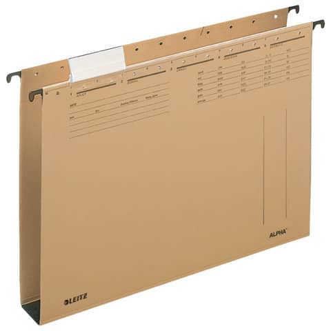 Hängesammler ALPHA®, seitlich offen, mit Hartpappeboden. Für Loseblatt-Ablage von Einzelakten. Mit Schlitzstanzung für Einsteckheftstreifen (6130), Hängeschiene mit kunststoffumsinterten Hängenasen, Vollsichtreiter und auswechselbaren Blanko-Schildchen. Material: Natronkarton 320 g/qm (RC). Für A4. Boden: 40 mm. Farbe: naturbraun.